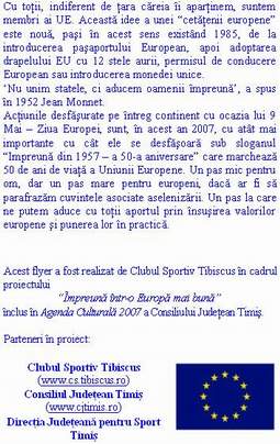 Clubul Sportiv Tibiscus din Timişoara a desfăşurat miercuri, 9 Mai 2007, acţiunea intitulată „Împreună într-o Europă mai bună”