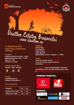 În 15 septembrie 2012, Braşovul a fost gazda unei noi ediţii din DUATLONUL CETATEA BRAŞOVULUI la care au luat parte sportivi din ţară şi din străinătate. |