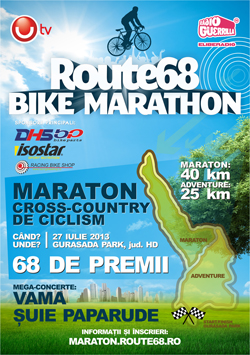 Pedaleaza in forta la cel mai muzical maraton cross-country de ciclism al verii si inscrie-te in cursa pentru cele 68 de premii! Calendar: 27 iulie 2013 Locatie: Gurasada Park Adresa: DN7 - Sat Gothatea, jud. Hunedoara |